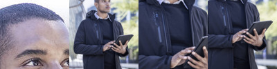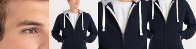 Hood with self-coloured herringbone draw cord. Two front pouch pockets. Self-coloured zip with removable branded zip puller. Covered zip for enhanced printability. Self-fabric cuffs and waistband.
