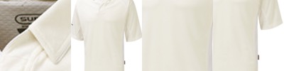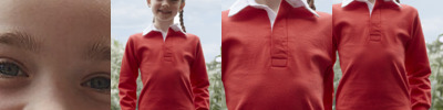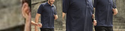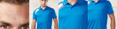 Quick drying fabric. Contrast panels. Flat knit collar. 2 button placket. Matching cover stitch. Twin needle finishing.
