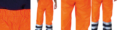 Conforms to EN ISO20471:2013 Class 1, EN343 against foul weather. Orange/Navy also conforms to GO/RT 3279 and approved for railway industry. Navy contrast helps to provide a corporate image whilst disguising dirt around the hem area. 100% waterproof Polyester with Oxford PU coating. Two 5cm wide reflective bands around lower legs. Elasticated waistband. Stitched and taped seams. Snap buttons on the bottom for adjustment. More colours available, code HVS461 & HVS462. Matching jackets, code HVP211 & HVP300.