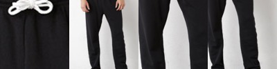 Elastic band at ankle opening. Elastic waistband. White cord drawstring.