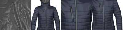 STORMTECH D/W/R durable water resistant outer shell. Quilted body with ultra soft liner. Centre front vislon zipper with contrast zipper teeth. Elasticized cuffs. Attached hood. Adjustable hem. Set-in sleeves. Brushed tricot hand warmer pockets. Zippered pockets with garages. Chin saver. Internal full-length storm flap. Inside pocket. Internal media port. Embroidery access.