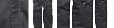 Multi-pockets including top pocket on flap. Knee pad bottom loading Velcro fastening. Rule pocket on front. Back patch pockets. Stud fastening on left side. Hammer loop. Reinforced back pockets,