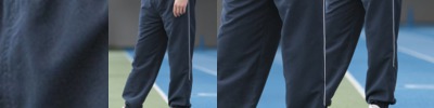100% polyester – microfibre with peached finish. Front pockets (right with zip as worn). Elasticated leg openings. Extra length side zips at hem. Back pocket with Velcro™ fastenings. Fully mesh lined. Elasticated waist with drawcord. White piping at side leg.