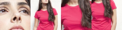 Modern fit women’s T. Longer length. Shaped side seams. Hemmed sleeved. Self fabric binding.