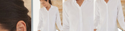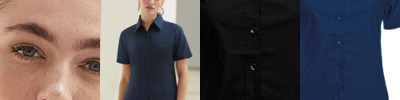 Soft collar styling. Rounded bottom hem. Fitted styling with bust darts and back darts. Easycare fabric, short sleeves. Pearlised buttons on light blue and white. Self colour buttons on remaining. Size 6, 8, 10, 12, 14, 16, 18, 20, 22, 24, 26 * size 6 only available in these colours