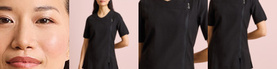 Beauty and Spa tunic with cross over neckline and asymmetric zip front. Short sleeve with vented cuff. Side vents. Princess seams with top-stitch detail for flattering fit. Easycare. Size 8, 10, 12, 14,16, 18, 20, 22, 24