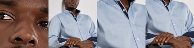 Fused collar. Stand up button down collar. Single needle stitched armholes. Twin needle stitched sleeve and side seams. Contrast inner collar stand, inner cuff and placket. Contrast binding down centre of button placket. Back yoke. Rounded hem. 2 spare bu