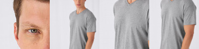 Short-sleeved T-shirt. Tubular construction, exact 2-ply V-neck,1x1 ribbed collar with Elastane.