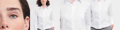 Innovative premium business shirt in a classic style. At the forefront of non-iron technology, this new fabric is designed to keep the wearer looking and feeling smart all day long. Stylish and relaxed long edged collar with fashionable twin button fastening. Shaping at the waist for flattering feminine silhouette with long, squared edge flared cuff with single button fastening and option for cuff links and rounded hem.