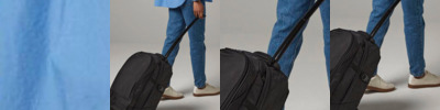 Neoprene handle, front zippered pocket, organiser section, large main compartment, concealed mono pole handle, pack away shoulder straps, fold down back flap for comfort, compressions straps, heavy duty wheel.