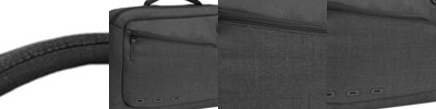 Adjustable webbing shoulder strap with pad, 2 large end pockets. Protective base feet.